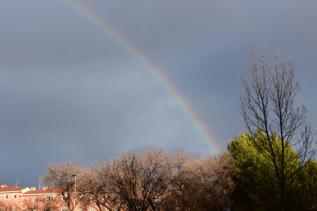 Once past we were led back onto the motorway and I started making good time again. My GPS turned me north at Murcia, and about 45 minutes along I came across another slow down. This time it wasn’t quite so bad, and I didn’t notice tractors, but rather just a couple hundred men blocking the road, surrounded by police holding them back. We were able to inch around them without a large detour and were once again on our way. Encountering no more protests I still made it to Teruel before dark and was even greeted by a lovely rainbow – I took that as a sign of better things to come.