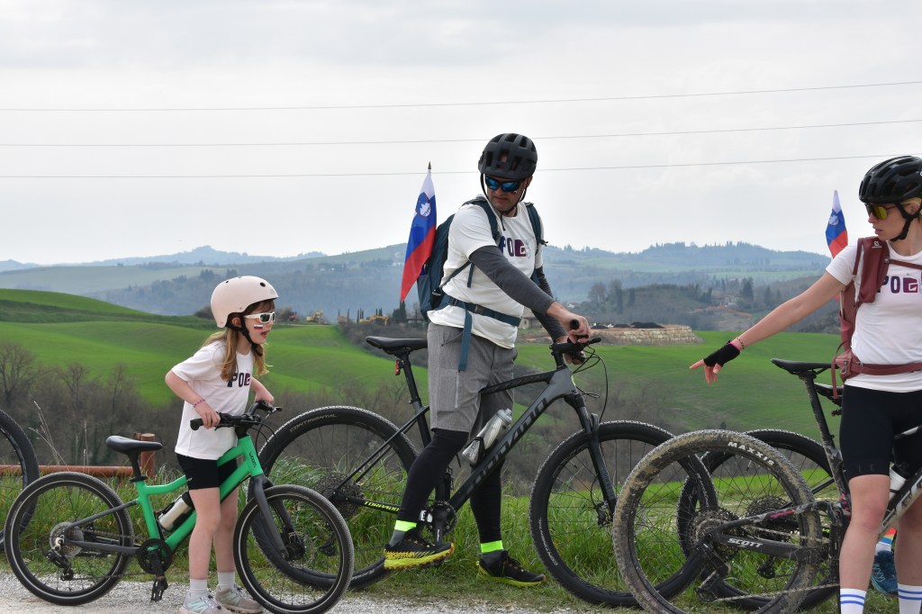 Race day started out nice and sunny, and the usual parade of amateur riders and fans started to pass by. One family were quite obviously Pogacar fans – even the little girl’s face had a Slovenian flag painted on it.