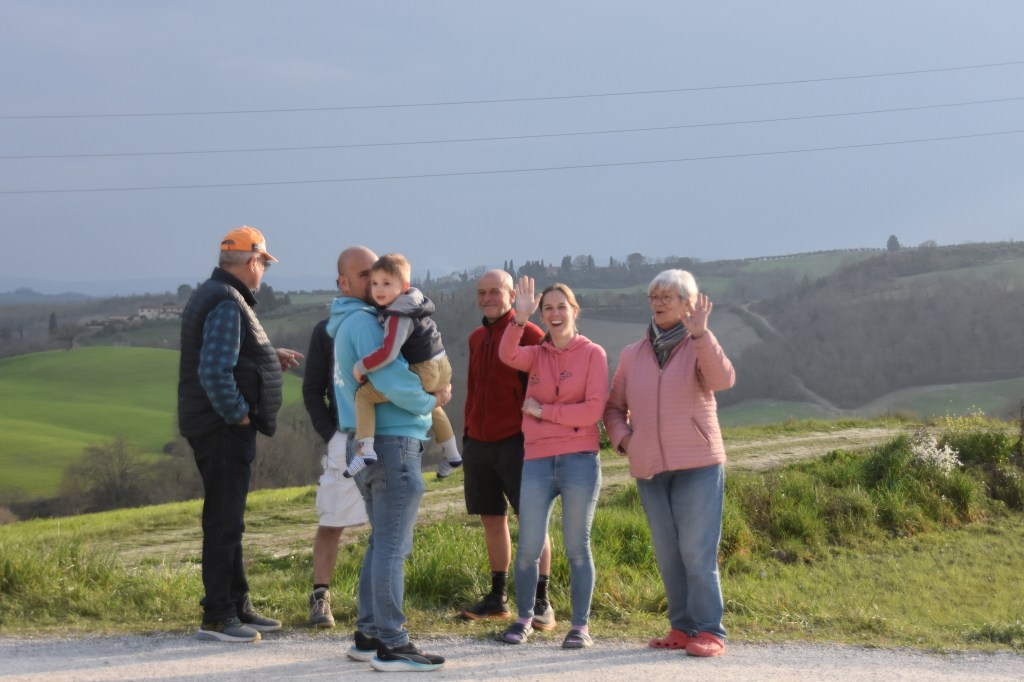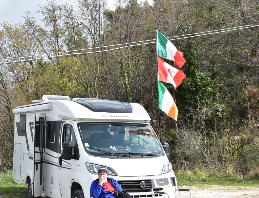 Leaving Asciano early – without breakfast or even a cup of tea (because of lack of electrics again) – we stopped in Castigliano del Lago for groceries. There was some kind of race going on – it looked like a walking/running race perhaps around the lake. After we parked once again at the aire in San Feliciano I saw one of the runners – looking fairly fit, but puffing on a vape as he ran.