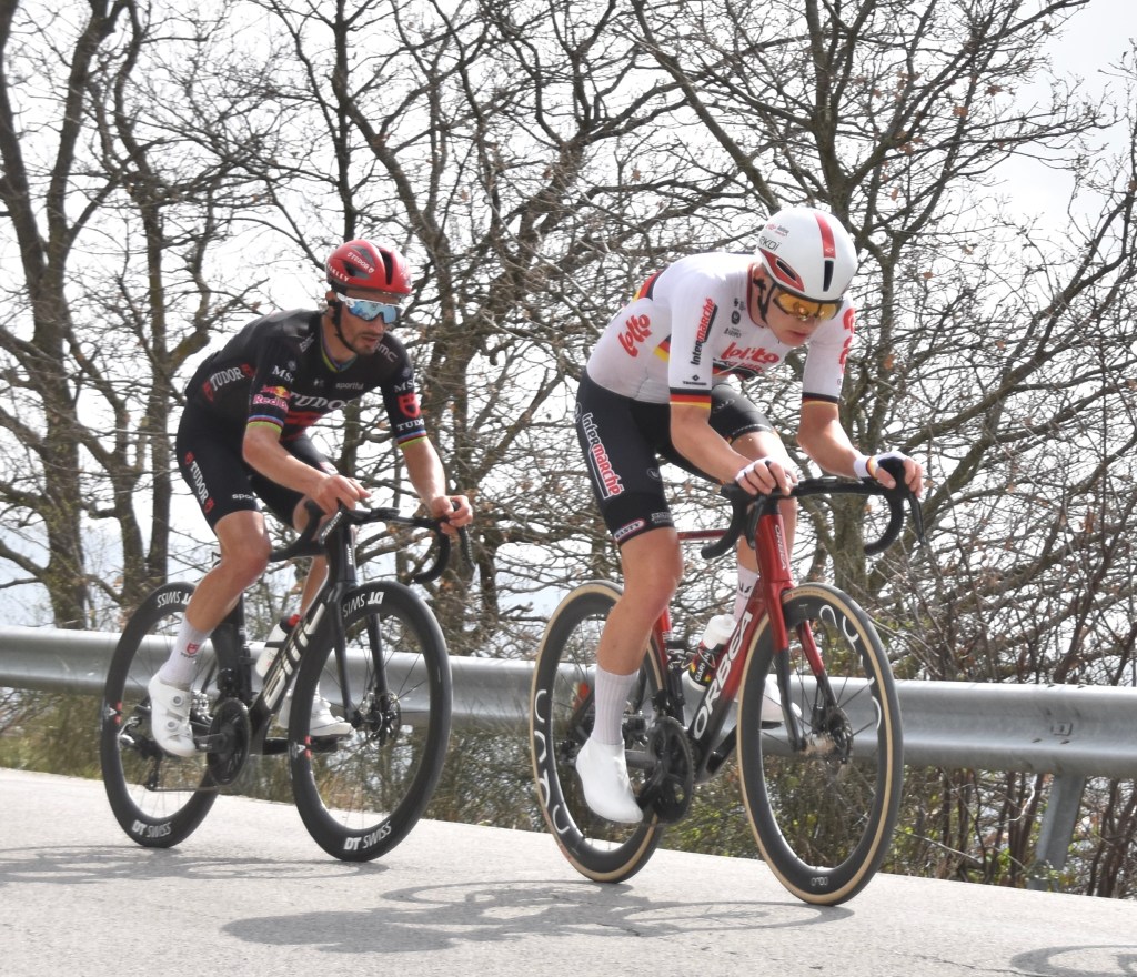 Alaphillipe was in the breakaway of seven or eight, with the peloton following around 5 minutes behind. Colin lucked out as the EF rider threw his bidon directly to him – it was the one he wanted the most this year.