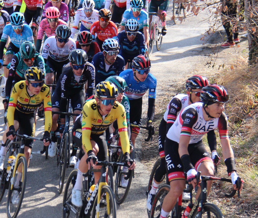 …and the peloton arrived just a minute later with Pogacar in blue right near the front.