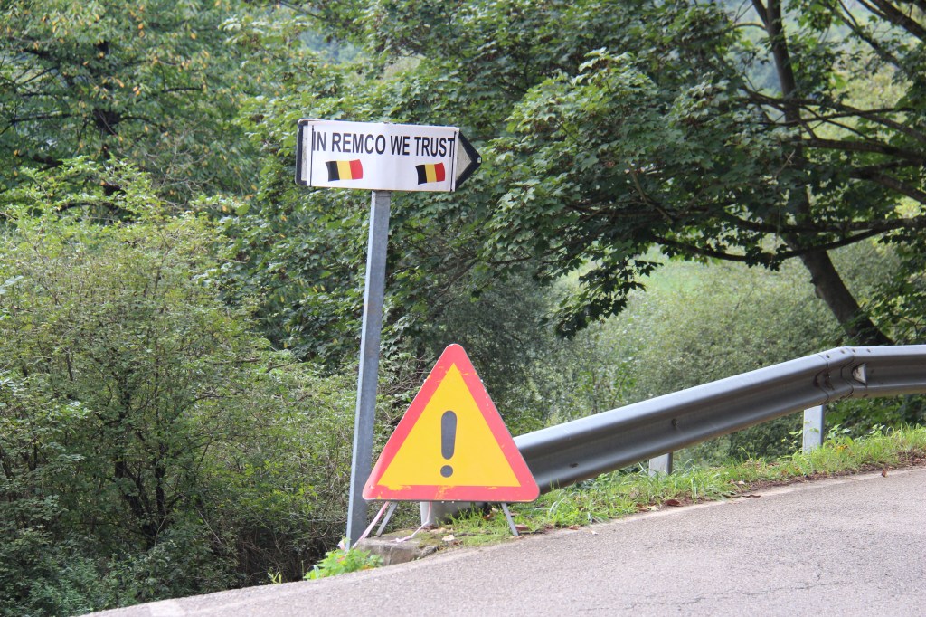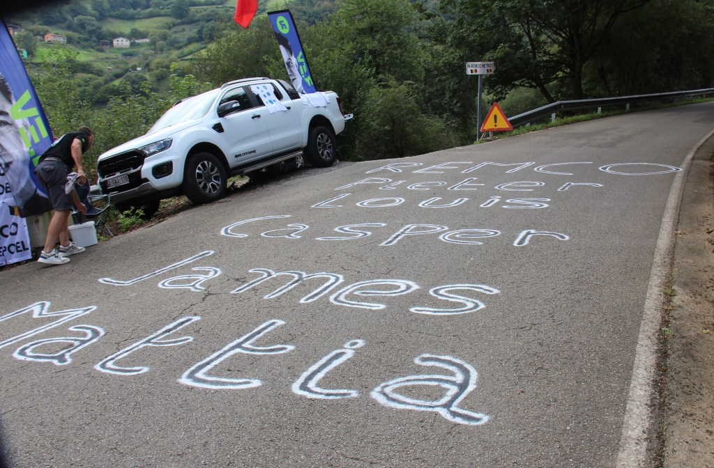 Just down from us some folks have painted the Quickstep rider’s names on the pavement and they’ve covered up the ‘Angliru’ sign with ‘in Remco we Trust’.