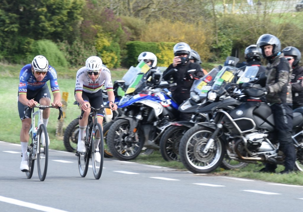 The second time around they came down the road rather than up, and four of the five favourites were all together – van der Poel, Pogacar, Pederson and Evenepoel.
